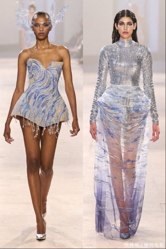 下半身的蓝紫渐变透视薄纱裙,则将海洋的静谧与深邃展现到极致。银色亮片绣出层层叠叠的水波纹,薄纱从腰部到裙摆由浅蓝缓缓过渡至深紫,如同从平静的浅滩一步步走向神秘的深海,层次分明间,藏着海洋独有的温柔韵律。这种一动一静的搭配,让整套造型既有水流奔涌的力量感,又有海水轻漾的柔美,无需多余修饰,便将自然之美与高定工艺的精致完美融合。